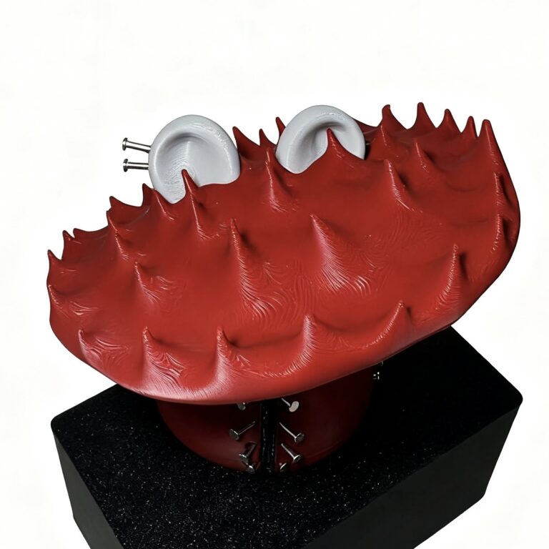 Cute 2-head Labubu doll inspired by Lady Gaga Abracadabra MV, detailed with deep red PLA body and durable stainless steel studs